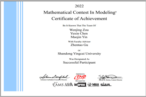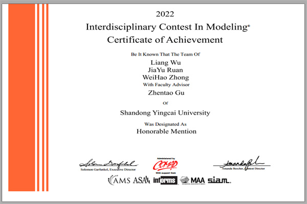 近日,2022年美国大学生数学建模竞赛成绩揭晓,由我校商学院谷振涛老师指导的代表队斩获国际二等奖(Honorable Mention)1项、国际三等奖(Successful Participant)1项。其中由2019级本科工商管理专业吴亮、本科信息管理与信息系统专业钟玮皓、本科物联网工程专业阮家玉组成的代表队荣获国际二等奖,由2019级本科工商管理(AISEC)专业邹温静、本科信息管理与信息系统专业陈宇馨、尹茂金组成的代表队获得国际三等奖。