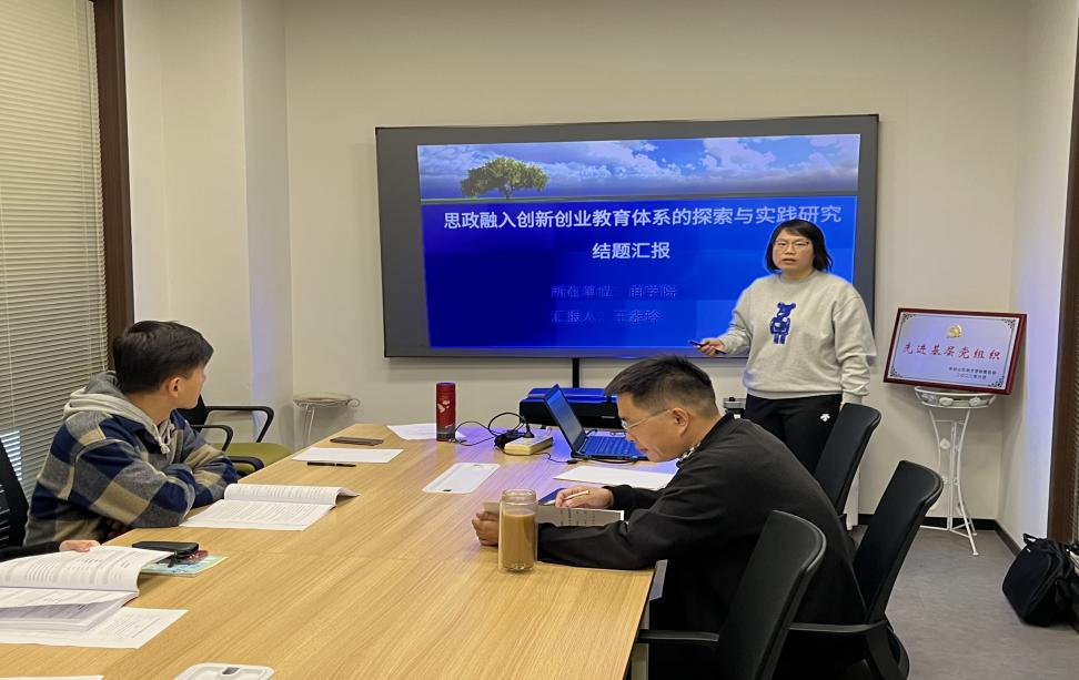 答辩人王素玲老师作题为“思政融入创新创业教育体系的探索和实践研究”的结题汇报,从研究内容、改革设计、项目成果、创新点、推广应用五部分进行陈述。该项研究取得了丰富的成果:已发表论文一篇,申请专利四项,且该项教改在学生中反响良好。商学院教学副院长殷永生和张伟老师对王素玲老师提出修改建议。