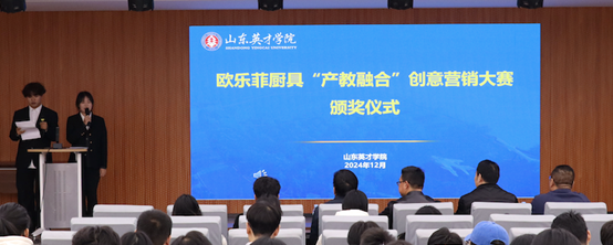 12月11日,商学院(国际学院)在明德楼300举办欧乐菲厨具“产教融合”创意营销大赛颁奖仪式。本次大赛由山东英才学院商学院国际商务系与山东欧乐菲家居用品有限公司联合举办,旨在通过创意营销大赛的形式,将课堂理论与商业实践紧密结合,激发学生的创新精神和实践能力。商学院(国际学院)院长赵坤、教学院长殷永生、山东欧乐菲家居用品有限公司总经理马磊、国际商务系主任尹瑞林、副主任韩旭,以及众多师生代表参与了此次活动。