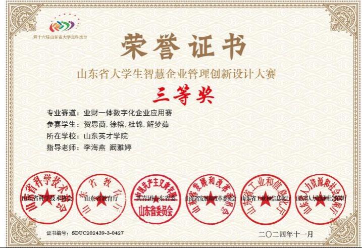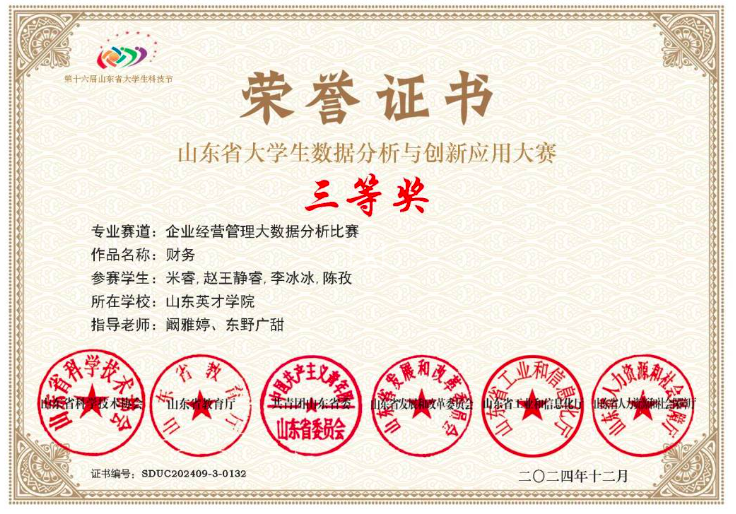 12月14日,由山东省科学技术协会、山东省教育厅、共青团山东省委等单位联合主办的第十六届山东省科技节在济南圆满落幕。山东英才学院商学院(国际学院)选派优秀学生团队参加多项赛事,取得了优异成绩。其中,米睿、赵王静睿、李冰冰、陈孜四位同学在指导教师阚雅婷、东野广甜老师的带领下,荣获山东省大学生数据分析与创新应用大赛三等奖。贺思茼、徐榕、杜锦、解梦茹四位同学在指导教师李海燕、阚雅婷老师的指导下,在山东省大学生智慧企业管理创新设计大赛中获得三等奖。