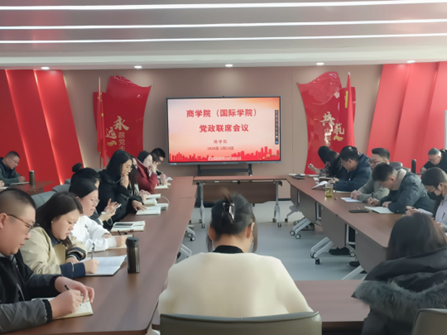 进一步做好新学期开学准备工作,商学院(国际学院)党政班子召开党政联席会议。会议围绕开学工作部署,强调将全面从严治党的理念贯穿于教育教学、师资队伍建设及学生返校安排等各个环节,确保各项工作有序推进。班子成员一致表示,将以此次会议为契机,强化责任担当,为新学期学院高质量发展开好局、起好步。