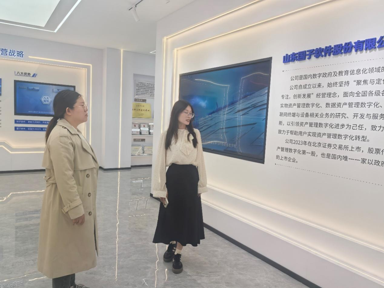 活动伊始,李蒙经理带领张静老师参观了公司的展示中心。在参观过程中,李蒙经理详细介绍了公司的发展历程、业务领域、企业文化和核心技术。贵公司专注于资产管理数字化业务方向,涵盖软件开发、技术服务、配套硬件产品等多个领域,在行业内取得了显著成就。