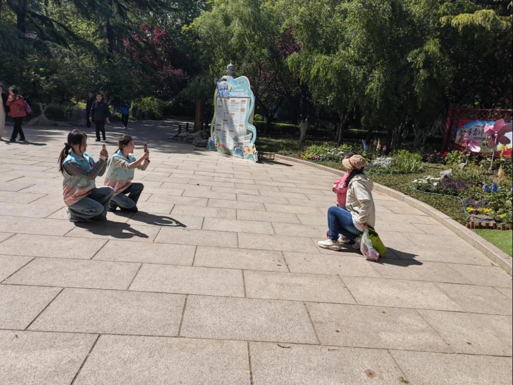 在公园各处,游客们不时向女大学生们求助,希望能帮忙记录美好瞬间。女大学生们欣然接过手机,耐心调整角度、指导姿势,帮游客定格与家人、朋友相伴的欢乐时刻,张张照片满是幸福笑容。
