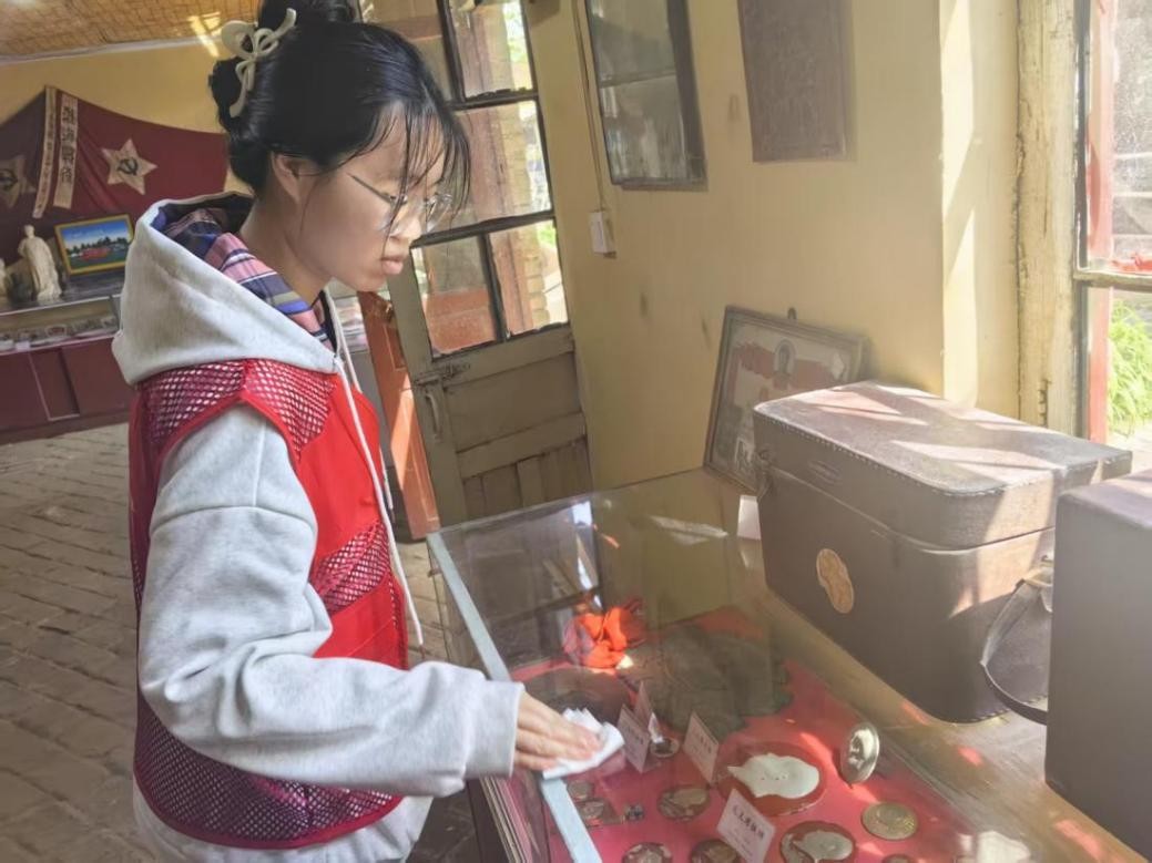 4月19日下午两点,实践团成员们准时抵达博物馆。在工作人员的带领下,实践团成员迅速投入到工作中。博物馆的清洁工作是首要任务,实践团成员们认真擦拭着展厅的展柜、桌椅,清扫地面,不放过任何一个角落。擦拭展柜时,实践团成员小心翼翼,生怕对文物造成哪怕一丝一毫的损伤,力求让展柜一尘不染,让文物以最佳状态呈现在观众面前。