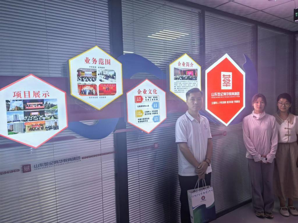 在山东世纪育华教育集团,三位老师参观了企业展厅,了解到集团业务涵盖中职教育、成考教育等多个领域,且秉持“立德树人、开拓创新、追求卓越、行稳致远”的理念。双方就人才培养、实习就业等方面展开深入交流,期待能在教育人才输送等领域建立长期合作关系,为学生提供更多教育行业的实践与就业机会。