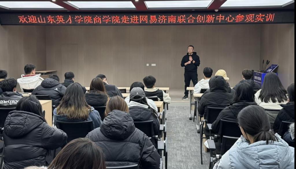 网易济南联合创新中心杨经理热情接待师生并开展专题讲解。他介绍了网易娱乐、网易严选等核心业务布局,重点阐述了网易济南联合创新中心在企业孵化、数字产业服务及人才培育方面的成果,同时结合国际商务、电子商务、新闻采编与制作专业特点,解析了数字经济领域创新创业工作及岗位技能需求。