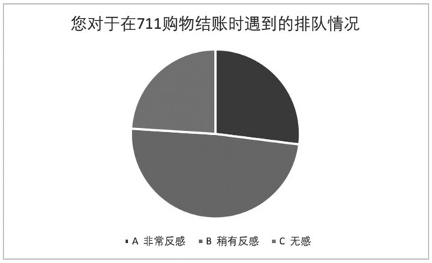 问卷还显示27%的顾客对结账排队非常反感,49%的顾客对结账排队稍有反感,在对此问题进行焦点小组访谈后发现7-11便利店高峰期分为三段,分别是早餐时7:00-8:30,午餐时段11:30-12:30和下午茶时段16:30-17:00,在此阶段7-11便利店经常出现排队结账的情况,同时店员的服务态度 下降也主要出现在该时间段。如图5: