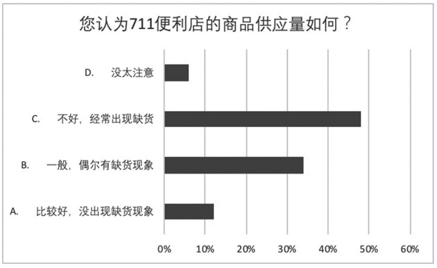 根据调查问卷,48%的顾客表示7-11便利店商品经常缺货,34%的顾客表示商品出现偶尔缺货的情况。在经过深度访谈和焦点小组访谈的调研后我发现多数受访者认为虽然711便利店采用的是特有的“共同配送计划”,但天津市区内大多数7-11门店没有实现这一优势,其原因大部分在于:①店员只去做收银这项工作,其他的事不做。如:不去观察门店里的货物哪些比较畅销、哪些比较难卖,因此盘点时不清楚哪些商品流动性大。②在电脑操作方面,不知道运用相关的技术,不清楚盘点的流程,导致货物未及时送达门店,或者配货不全。如图2: