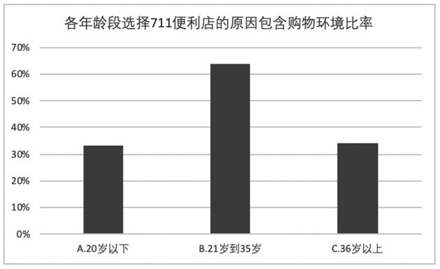 在20岁以下年龄段中有百分之33的人选择7-11便利店的原因包括购物环境,21岁-35岁年龄段中有64%的人,36岁以上的人中有34%,可见购物环境在消费者选择7-11便利店的原因中占据不小的比率,需要作为一个细分模块深入调研。 如图1:
