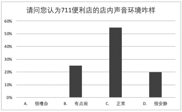 问卷显示75%的受访者认为7-11便利店店内声音环境正常或是很安静,25%的受访者认为有点闹,没有选择很嘈杂的人选。但在焦点小组访谈中,有部分受访者建议7-11便利店在高峰期和普通时间段增加不同店内音乐来提升购买环境以及消费者购物感受。如图3: