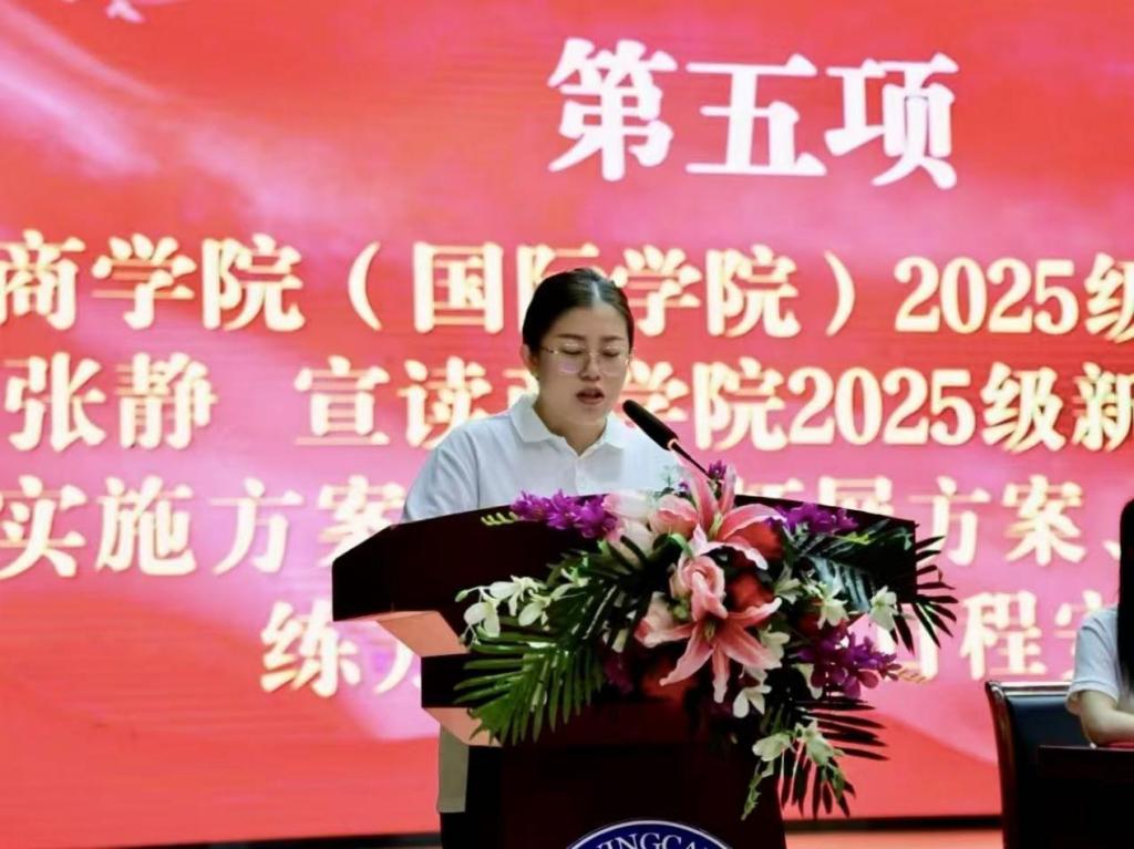 2025级年级长张静宣读了《商学院2025级新生军训实施方案》《素质拓展方案》《口才训练方案》并详细解读了军训日程安排。她表示,学院精心设计了内容丰富、形式多样的训练项目,既包括基本的军事技能训练,也融入了素质拓展和口才训练等特色内容,旨在全面提升新生的综合素养。