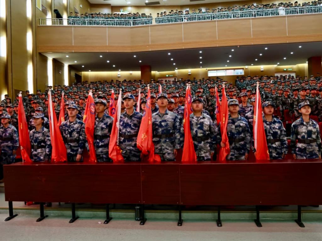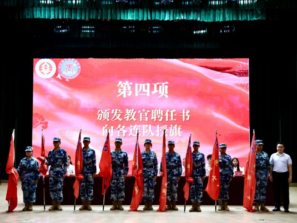 在激昂的进行曲中,主席台领导、老师向教官颁发了聘任证书,并由赵坤院长向各连队授予了队旗。一面面红旗挥舞,展现了2025级新生昂扬向上的精神风貌。