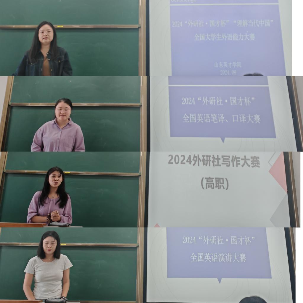 在段宇哲老师的主持下,李媛、宋美婷、方佳铭、宋璧君四位教师依次对“外研社国才杯”英语组四项赛事:综合能力、演讲、翻译及写作大赛,进行了详尽且系统的阐述。该赛事旨在全面评估和提升学生的外语能力,涵盖阅读理解、语言表达、批判性思维、逻辑推理、即时反应、英汉互译技巧以及文化理解等多个方面。此外,赛事鼓励学生以英语为工具思考国家发展全局,促进中外文化的交流与融合。同时,该赛事亦为学生构建了一个展现个人才华及检验外语教育成果的重要平台。
