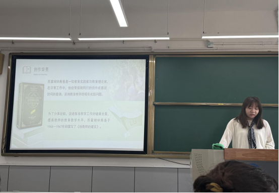 为进一步提升教师队伍专业素养,深入贯彻《中共中央国务院关于弘扬教育家精神加强新时代高素质专业化教师队伍建设的意见》文件精神,公共英语教研室于4月15日下午举办主题为“悦读成长计划”的读书分享活动。本次活动由陈伟老师主持,谭思聪老师作为主讲人,与全体教师深度分享了苏联教育学家苏霍姆林斯基经典著作《给教师的建议》的阅读感悟。