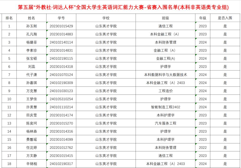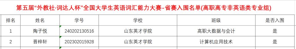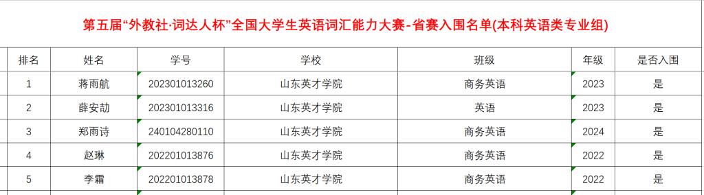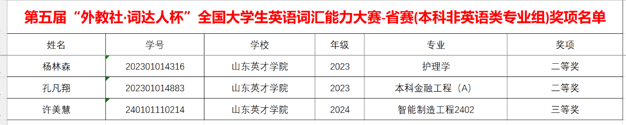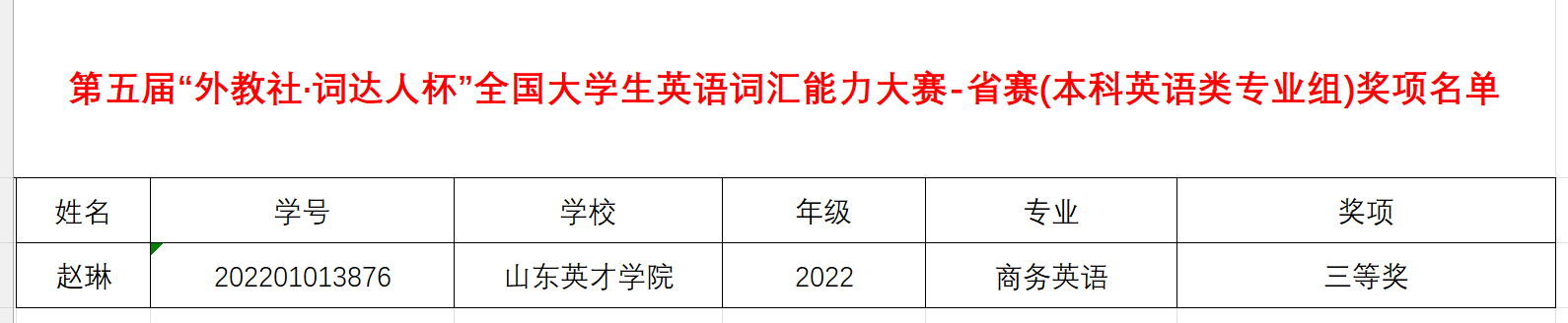 近日,第五届“外教社·词达人杯”全国英语词汇能力大赛圆满落幕。经过校赛、省赛的激烈角逐,我校学子表现优异,在英语专业赛道和非英语专业赛道中均取得佳绩。英语专业赛道的赵琳同学荣获省级三等奖;非英语专业赛道的杨林森、孔凡翔同学荣获省级二等奖,许美慧同学荣获省级三等奖,展现了我校学生扎实的英语词汇功底,良好的综合素质和竞技水平。