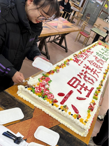 作为开业活动的重头戏,后勤处特别定制了一座3米长的“六星街美食城盛大开业”主题蛋糕,以奶油雕花、水果点缀为设计亮点,寓意师生甜蜜启程新学年。蛋糕分享环节中,师生们有序排队领取,现场欢声笑语不断。有学生感慨:“没想到返校第一天就能吃到这么有仪式感的蛋糕,感觉特别温暖!”