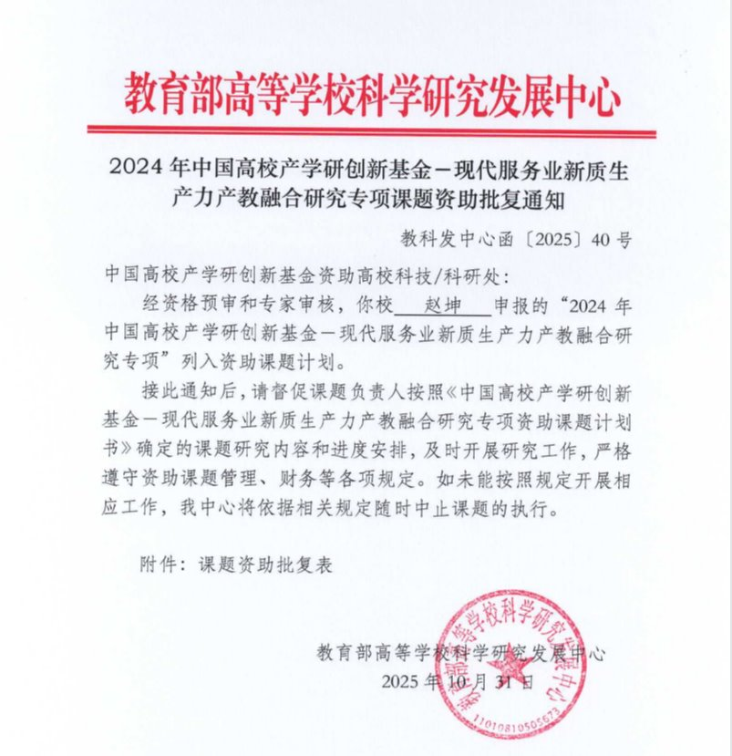 近日,我校在国家级科研项目申报中取得突破,由商学院(国际学院)赵坤老师主持申报的《产教融合视域下电子商务人才培养体系构建与实践》项目,成功获批教育部“中国高校产学研创新基金——现代服务业新质生产力产教融合研究专项”课题。此次立项是我校首次获批该类教育部专项课题,标志着学校在主动服务国家战略、深化产教融合方面迈出了关键一步。